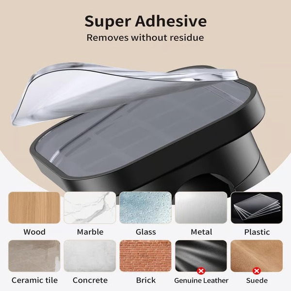 Se fixează ferm pe suprafețe plane precum lemn, gresie, metal și pereți netezi.