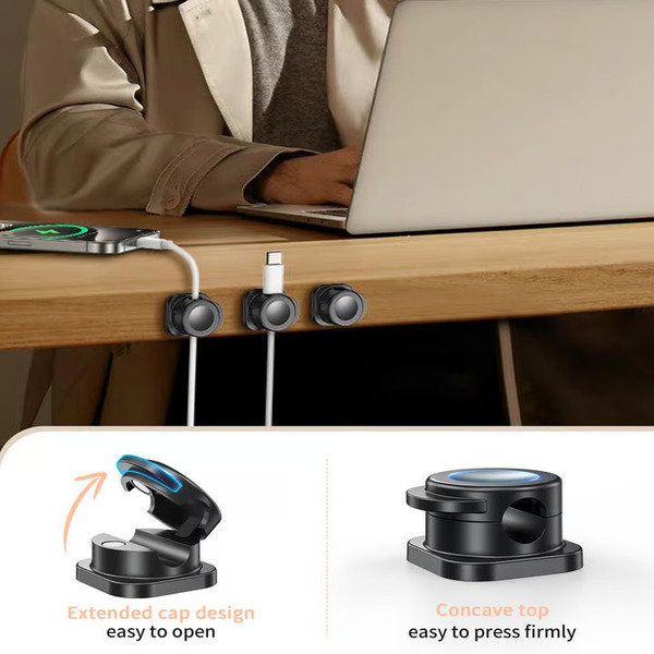 Păstrează cablurile de încărcare ordonate și previne căderea lor de pe birou.