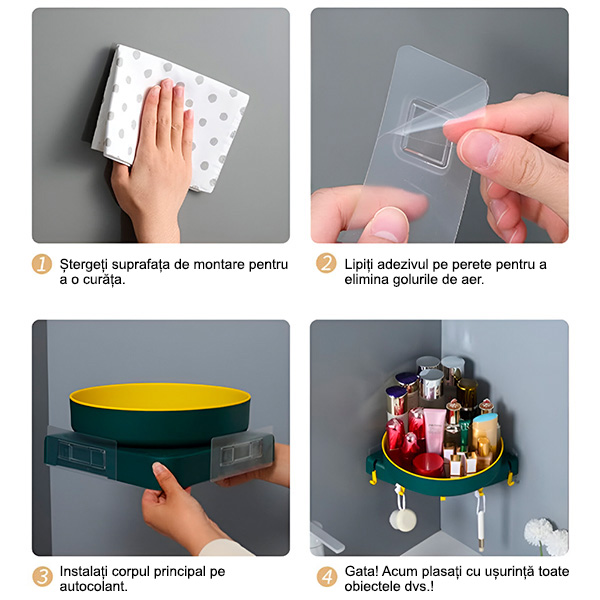 Organizatorul rotativ pentru colț vă ajută să utilizați eficient spațiile nefolosite, păstrând obiectele organizate și ușor accesibile.